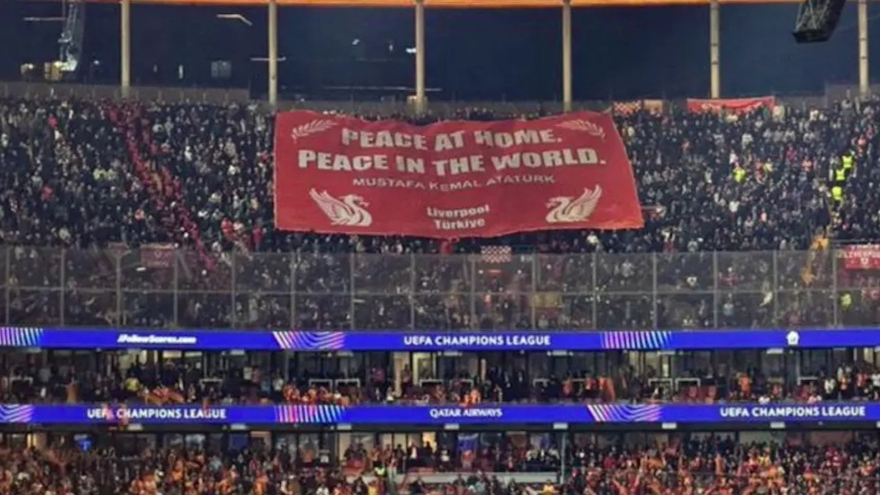 Liverpool FC taraftarları, Galatasaray deplasmanında tribünde Mustafa Kemal Atatürk’ün “Yurtta sulh, cihanda sulh” sözünü İngilizce olarak pankarta taşıdı.