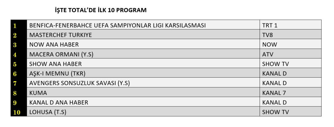 AB izleyici kitlesinde de 1.sırayı UEFA Şampiyonlar Ligi maçı aldı. Masterchef Türkiye ve Now Ana Haber, zirvenin hemen ardından yer aldı.