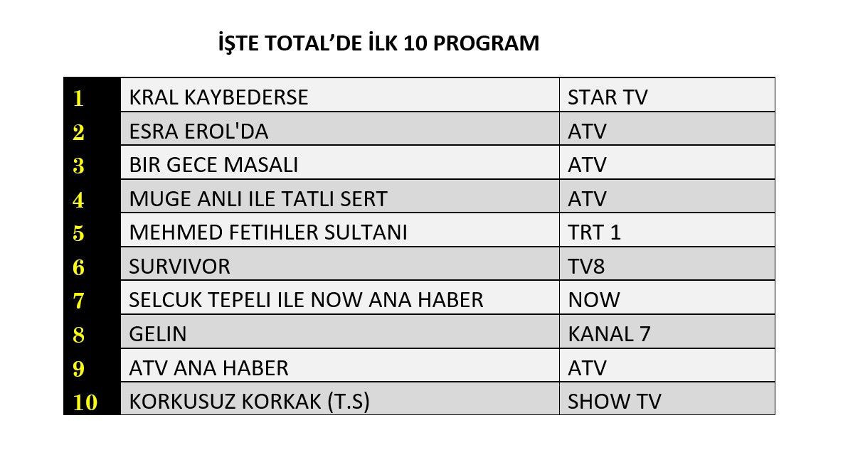 Total grubunda günü Star TV'nin sevilen dizisi Kral Kaybederse zirvede kapattı. Gündüz kuşağında yer alan Esra Erol’da ikinci sıraya yerleşirken, Atv'nin yeni dizisi Bir Gece Masalı üçüncü sırada yer aldı.