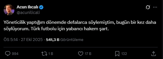 Acun Ilıcalı, "Yöneticilik yaptığım dönemde defalarca söylemiştim, bugün bir kez daha söylüyorum. Türk futbolu için yabancı hakem şart" ifadelerini kullandı.