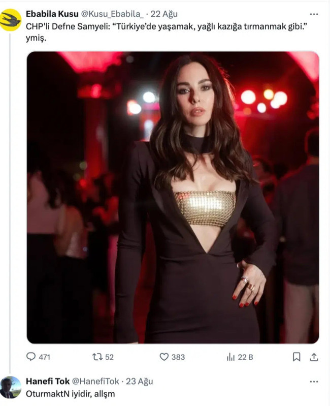 Ünlü sunucu ve şarkıcı Defne Samyeli, kısa süre önce tutuklu gazeteci Fatih Altaylı'nın YouTube kanalı "Yorumlayamıyor" programında Türkiye'deki yaşam şartlarını eleştiren açıklamalarda bulundu. Samyeli, "Türkiye’de yaşamak, yağlı kazığa tırmanmak gibi. Zor, yorucu ama bir şekilde devam etmek zorundasınız"diyerek dikkat çekti.