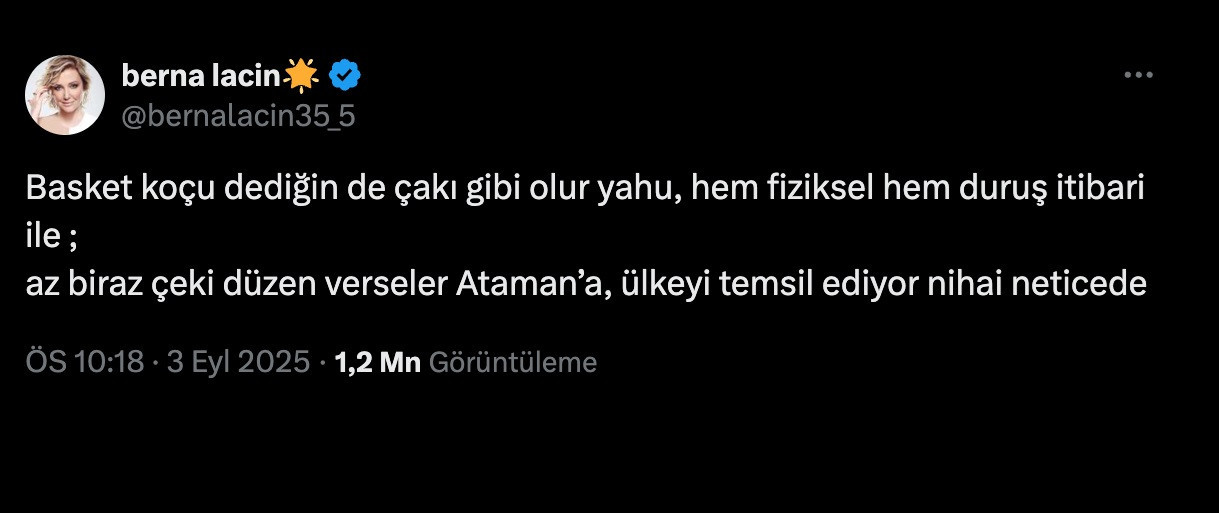 Laçin, sosyal medya hesabından yaptığı açıklamayla A Milli Basketbol Takımı Başantrenörü Ergin Ataman’ı hedef aldı. Berna Laçin, “Basket koçu dediğin de çakı gibi olur yahu, hem fiziksel hem duruş itibari ile; az biraz çeki düzen verseler Ataman’a, ülkeyi temsil ediyor nihai neticede “ ifadelerini kullandı.
