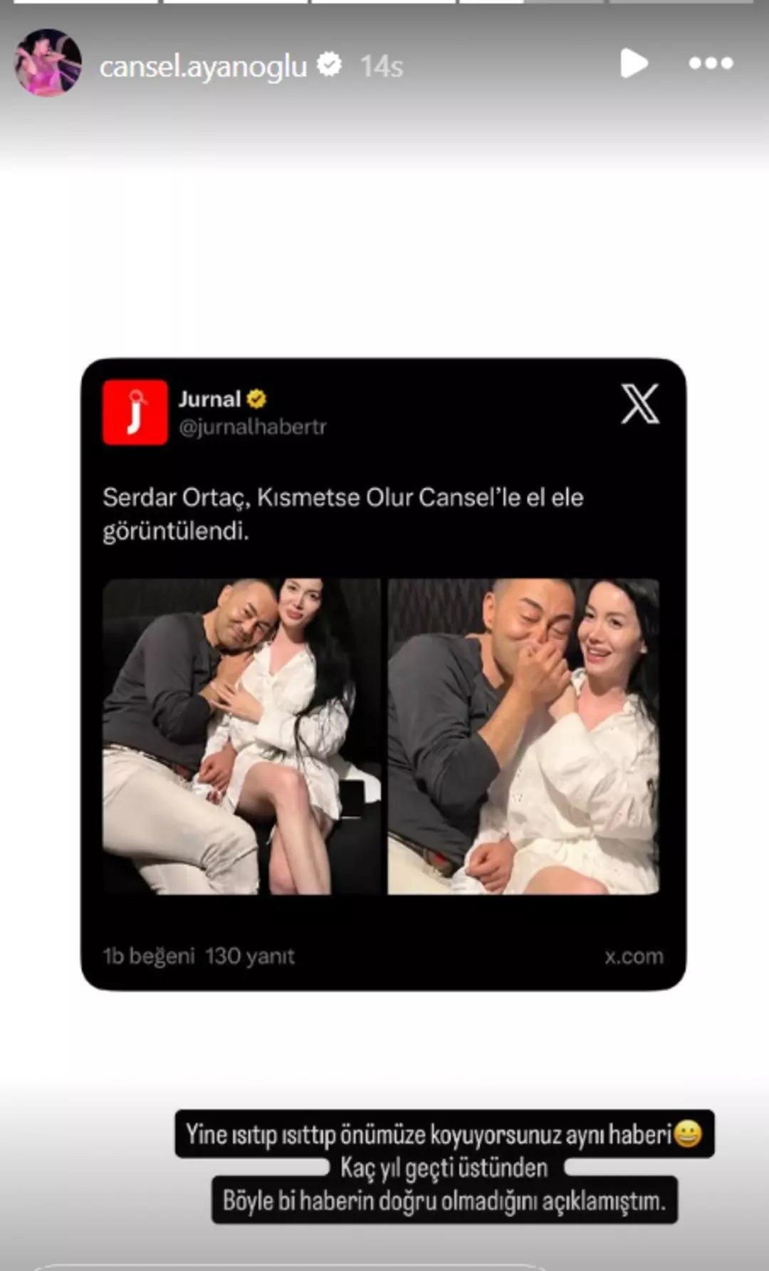 Ancak Kısmetse Olur Cansel bu duruma sinirlendi. Pozların yeniymiş gibi paylaşılmasına kızan Cansel "Yine ısıtıp ısıtıp önümüze koyuyorsunuz. Kaç yıl geçti üstünden. Doğru olmadığını açıklamıştım" dedi.