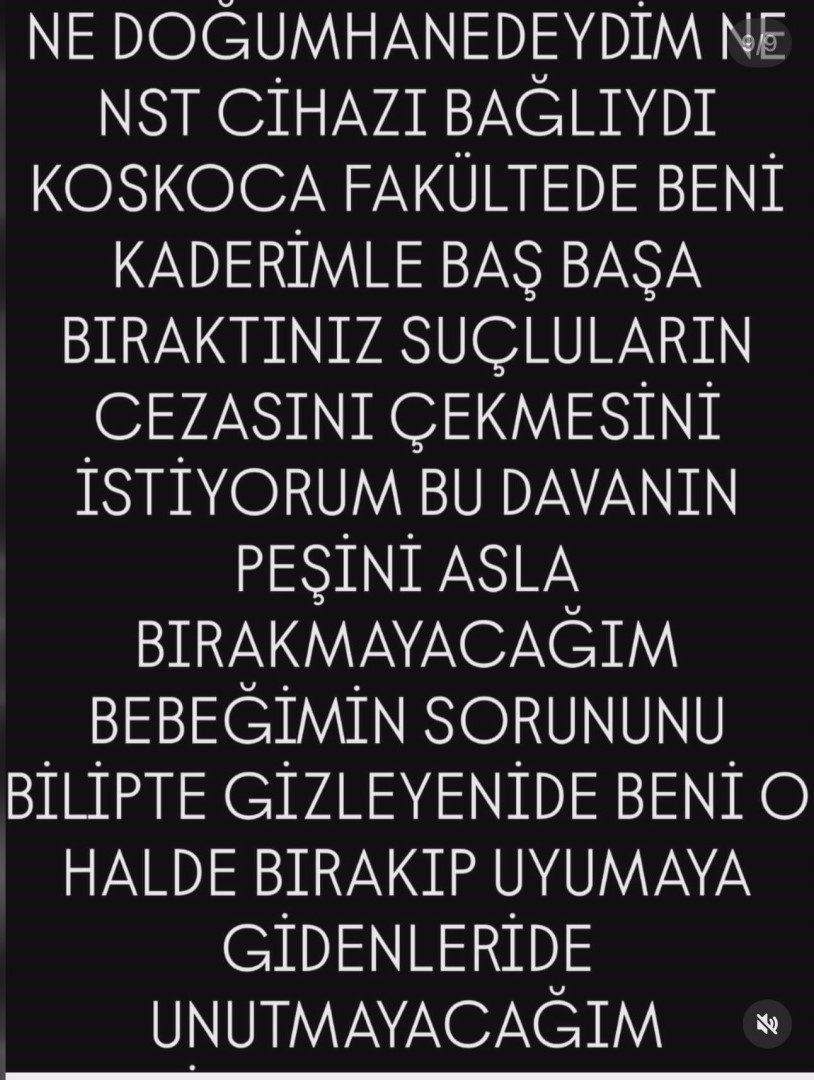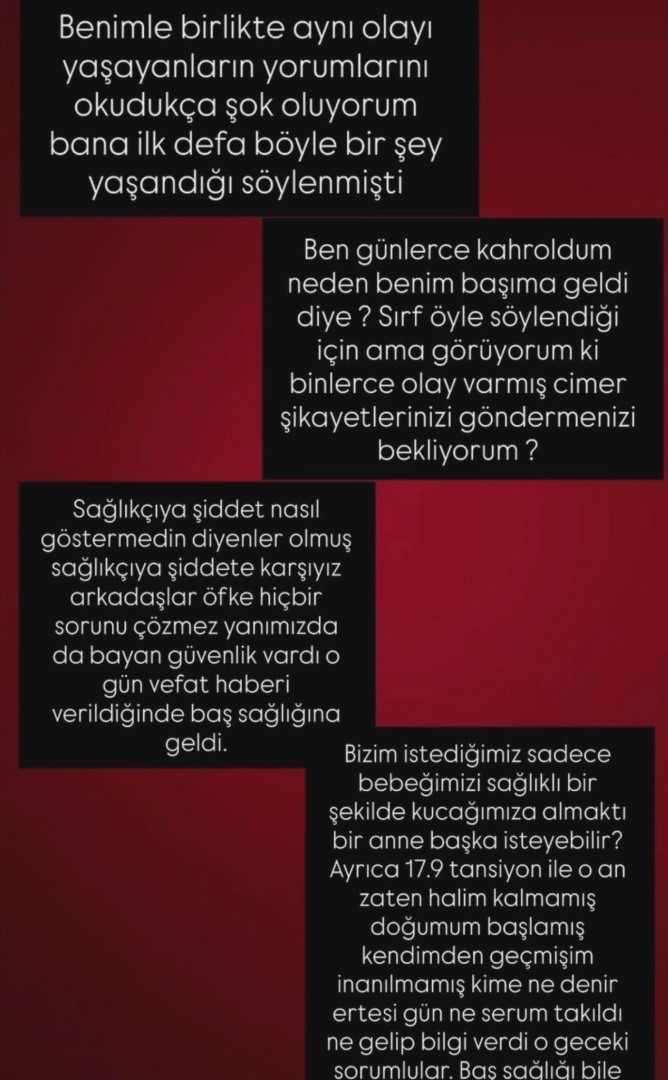 Daha sonra bankoya geçtiğimizde kaydım yapılırken kadın doğum servisinde normal bir odaya alınacaktım. Doğumhaneye değil, normal bir servise alınacaktım. Odaya alınırken sancılarım tuttu. Bana karın ağrısı dediler. Zaten açılmam vardı ama normal bir servis odasına alındım. NST'ye bağlanmadım. Sadece bir serum takıldı, bir ilaç takıldı. Bir ara kendimden geçtim. 'Sancıların geçecek, bekleyeceksin' dediler. Benim 2 dakikada bir sancılarım geliyordu. Çok kuvvetli bir şekilde bağırıyordum. 'Karın ağrısı, normal, bu doğum sancısı değil' dediler" ifadelerini kullandı.