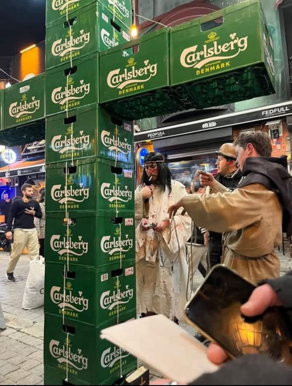 Eskişehir’de 3 kişi, 30 Ekim Perşembe gece 23.00 sıralarında ‘Cadılar Bayramı’ etkinliğine katılmak için boş bira kasalarından Hristiyanlara ait haç işareti oluşturarak sokaklarda gezdi.