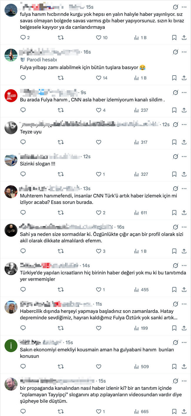 “CNN TÜRK Sloganıyla keşke tanıtım yapmasaydınız” diyen Fulya Öztürk, “Daha özgün olmanızı beklerdik” ifadeleri ile tepkisini dile getirdi.