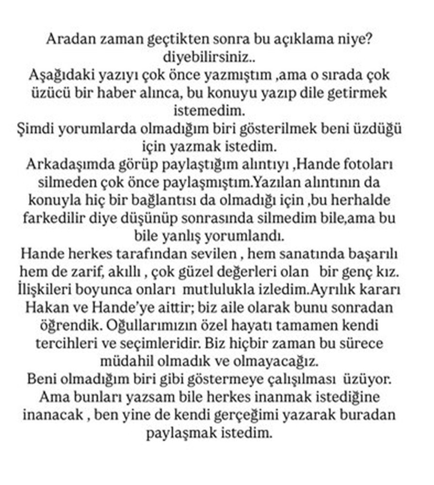 Arkadaşımla görüp paylaştığım alıntıyı, Hande fotoğrafları silmeden çok önce paylaşmıştım. Yazılan alıntının da konuyla hiç bir bağlantısı olmadığı için, bu herhalde fark edilir diye düşünüp sonrasında silmedim bile, ama bu bile yanlış yorumlandı. Hande herkes tarafından sevilen, hem sanatında başarılı hem de zarif, akıllı, çok güzel değerleri olan bir genç kız. İlişkileri boyunca onları mutlulukla izledim. Ayrılık kararı Hakan ve Hande’ye aittir; biz aile olarak bunu sonradan öğrendik."