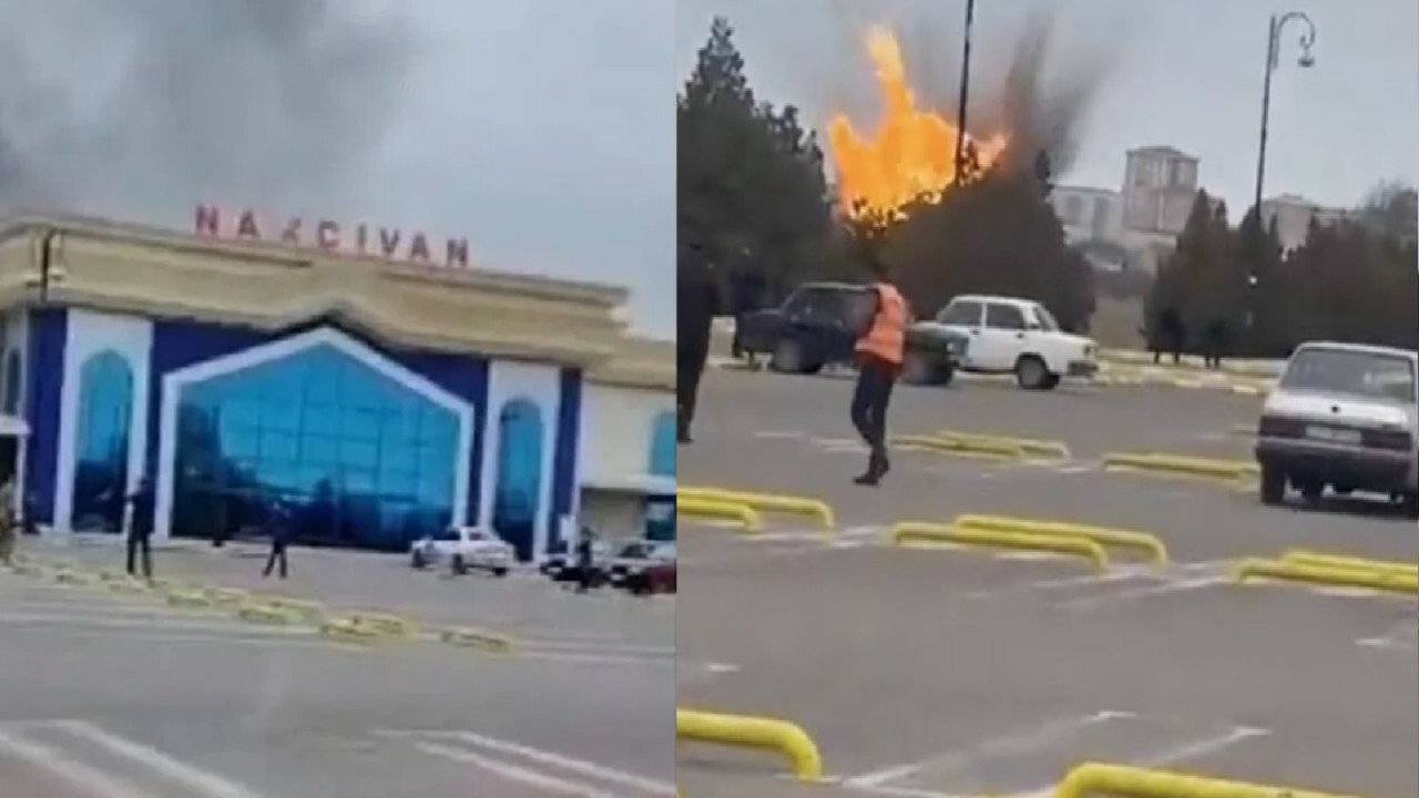 Videolardan birinde, Nahçıvan Uluslararası Havalimanı binasından yükselen duman ve itfaiyecilerin yangınla mücadele ettiği görülüyor.