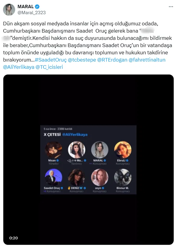 Sosyal medya platformunda açılan bir sohbet odasında Cumhurbaşkanı Başdanışmanı olan Saadet Oruç'un bir yurttaşa küfrettiği anlar gündem oldu.