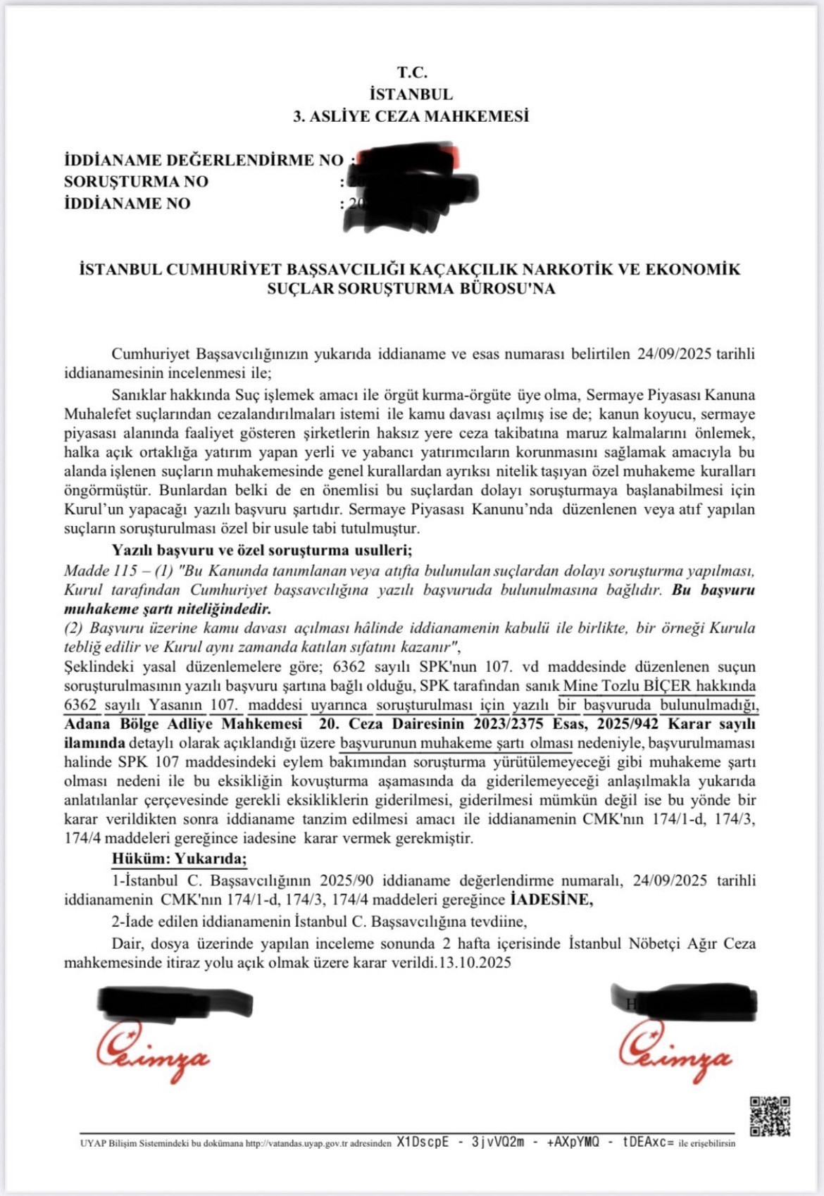 Marka Yatırım Holding ile ilgili manipülasyon davasında 3 asliye ceza mahkemesi iddianameyi şahsım adına Spk’nın bir şikayeti olmaması nedeniyle reddetmiştir.