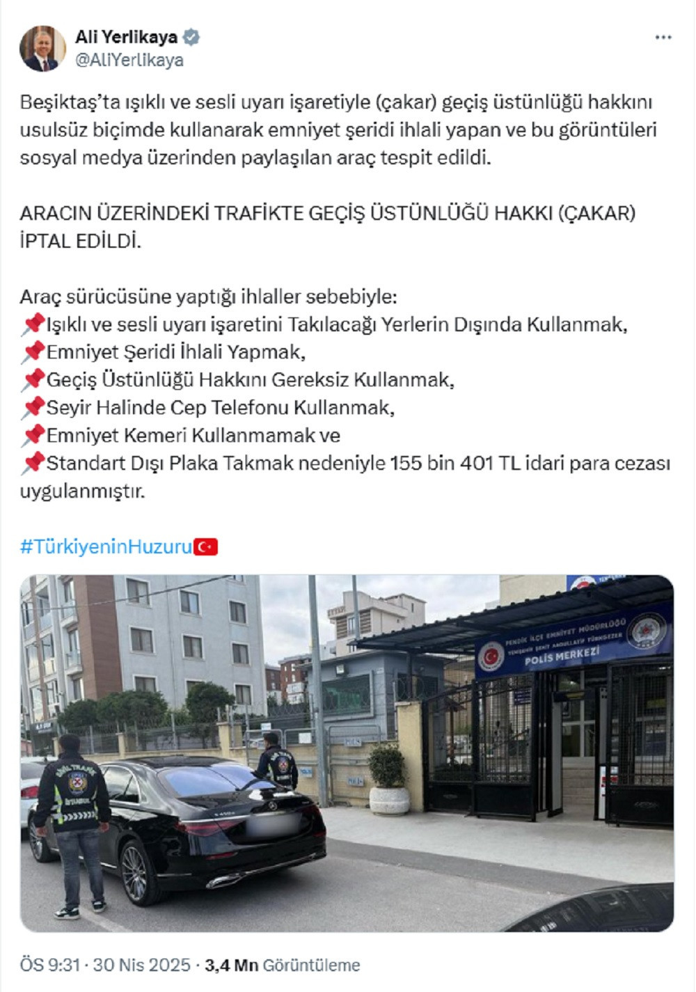 “Beşiktaş’ta ışıklı ve sesli uyarı işaretiyle (çakar) geçiş üstünlüğü hakkını usulsüz biçimde kullanarak emniyet şeridi ihlali yapan ve bu görüntüleri sosyal medya üzerinden paylaşılan araç tespit edildi. Aracın üzerindeki trafikte geçiş üstünlüğü hakkı (çakar) iptal edildi.”