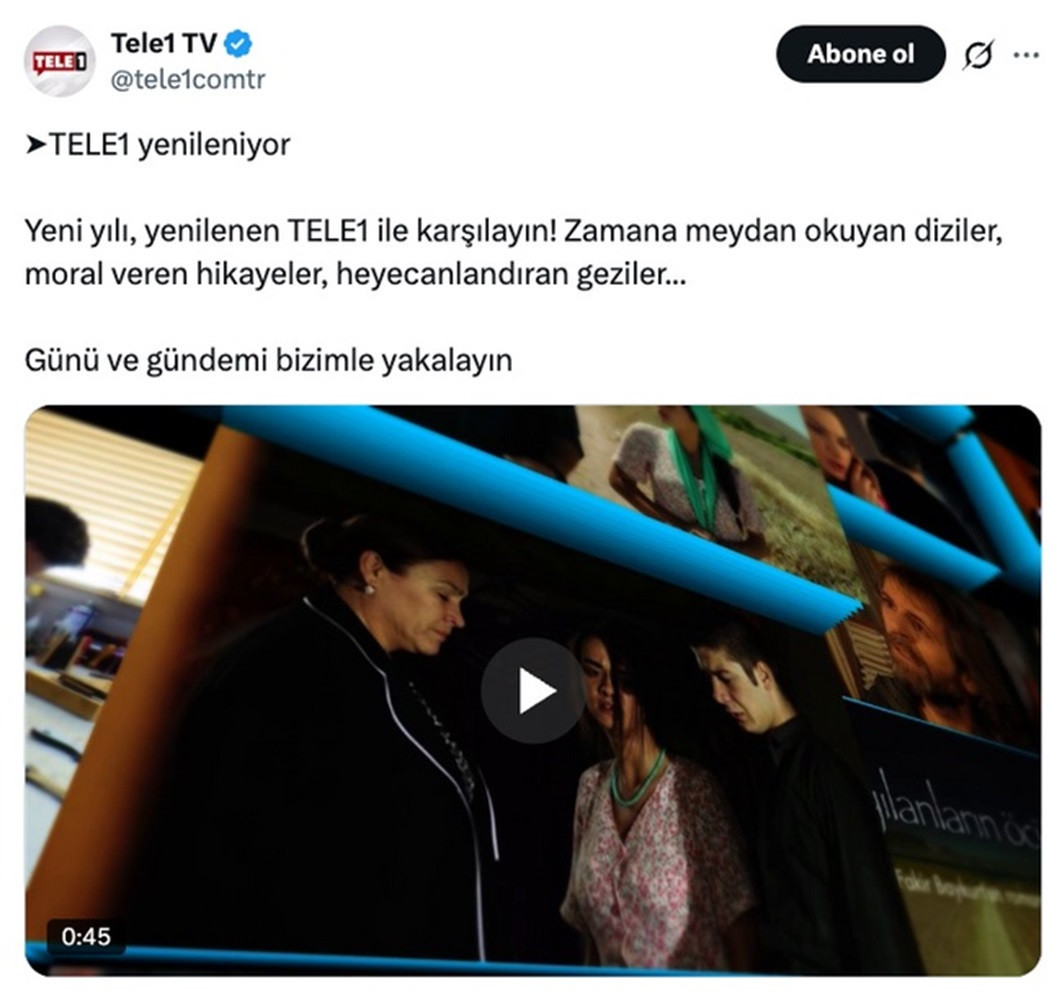 "Yeni yılı, yenilenen TELE1 ile karşılayın! Zamana meydan okuyan diziler, moral veren hikayeler, heyecanlandıran geziler..."
