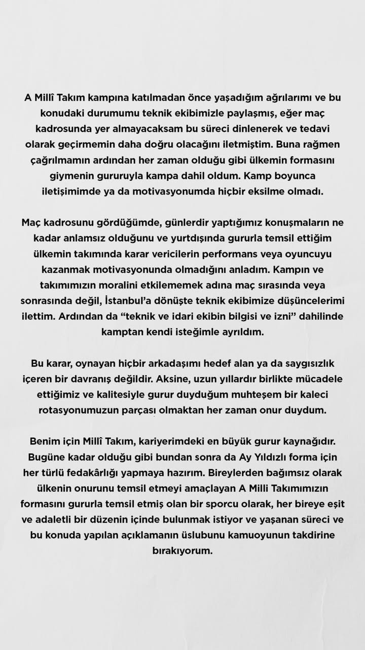 A Milli Takım forması giymenin her zaman en büyük gurur kaynağı olduğunu vurgulayan Berke Özer “Bu karar hiçbir arkadaşımı hedef almıyor. Benim için önemli olan adaletli bir düzenin içinde yer almak. Yaşanan süreci ve açıklamanın üslubunu kamuoyunun takdirine bırakıyorum” dedi.