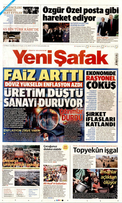 Yeni Şafak dün, Şimşek'i hedef aldığı 19 Nisan tarihli baskısının ardından bu defa "İş dünyasında faiz isyanı" başlığı ile çıktı. TOBB'un düzenlediği Türkiye Ekonomi Şurası'nda iş dünyası temsilcilerinin yüksek faiz politikasını eleştirdiğini ifade eden Yeni Şafak, 'Yüksek finansman maliyeti üreticinin ayağına pranga" başlığını kullandı.