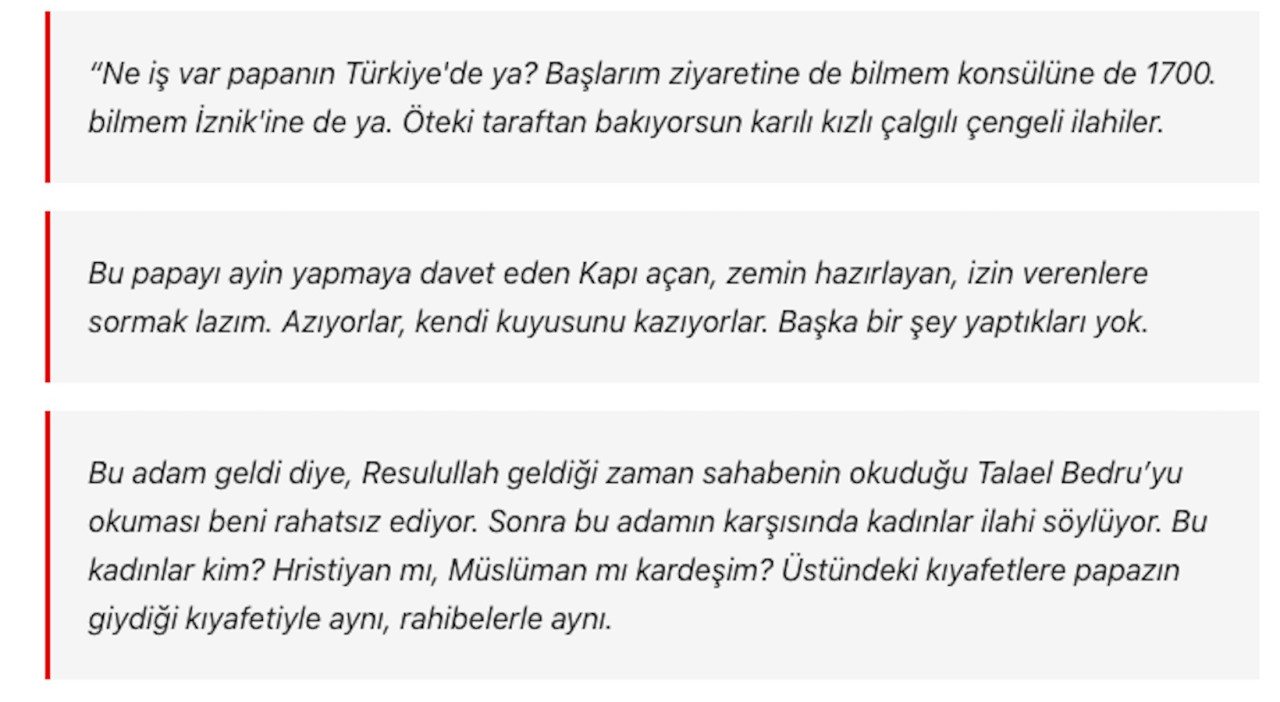 İngilizce Hristiyan ilahisini seslendiren korodaki Türk kadınların görüntüsü dikkat çekti. Kadınlardan birinin cübbesi rahibe cübbesini andırırken, başında türbanla Hristiyan ilahisi söylemesi kızgınlığı daha da artırdı. Tarikatların sözcüleri, sosyal medya hesabından bu konuyu öfkeli bir dille tartışmaya açtı. Tarikatçı hesaplarca bu olay, “Üstü İslam altı Vatikan kim bu kadınlar” diye sorgulandı. Bu isimlerin tepkileri özetle şöyle: