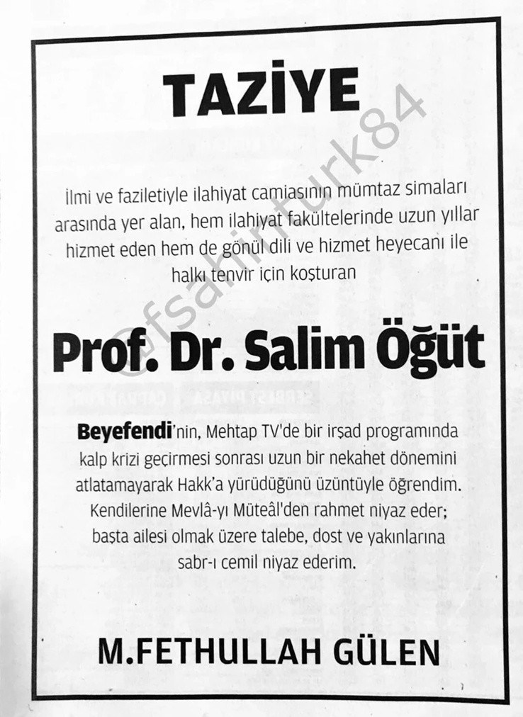 “İlmi ve faziletiyle ilahiyat camiasının mümtaz simaları arasında yer alan, hem ilahiyat fakültesinde uzun yıllar hizmet eden hem de gönül dili ve hizmet heyecanı ile halkı tenvir için koşturan Prof. Dr. Salim Öğüt Beyefendi'nin, Mehtap TV'de bir irşad programında kalp krizi geçirmesi sonrası uzun bir nekahet dönemini atlatamayarak Hakk'a yürüdüğünü üzüntüyle öğrendim. Kendilerine Mevlâ-yı Müteal'den rahmet niyaz eder; başta ailesi olmak üzere talebe, dost ve yakınlarına sabr-ı cemil niyaz ederim.”