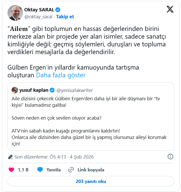Cumhurbaşkanı Başdanışmanı Oktay Saral, sanatçı Gülben Ergen’in aile odaklı bir projede yer almasını eleştirdi. Sosyal medya hesabından yaptığı paylaşımda Ergen’i eleştiren bir mesajı alıntılayan Saral, projede yer alan isimlerin geçmişleri ve topluma verdikleri mesajlarla değerlendirilmesi gerektiğini belirtti.