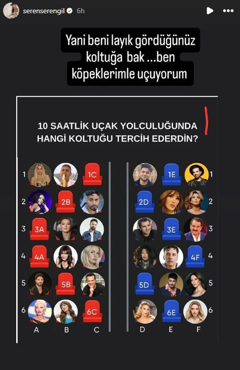Sosyal medya, Seren Serengil ve Gülben Ergen'i bir kez daha karşı karşıya getirdi. Ünlü isimleri yan yana koyularak yapılan "Hangi koltuğu tercih ederdin?" akımı Seren Serengil'i kızdırdı. Serengil, "Ben köpeklerimle uçuyorum!" diyerek tepki gösterdi.