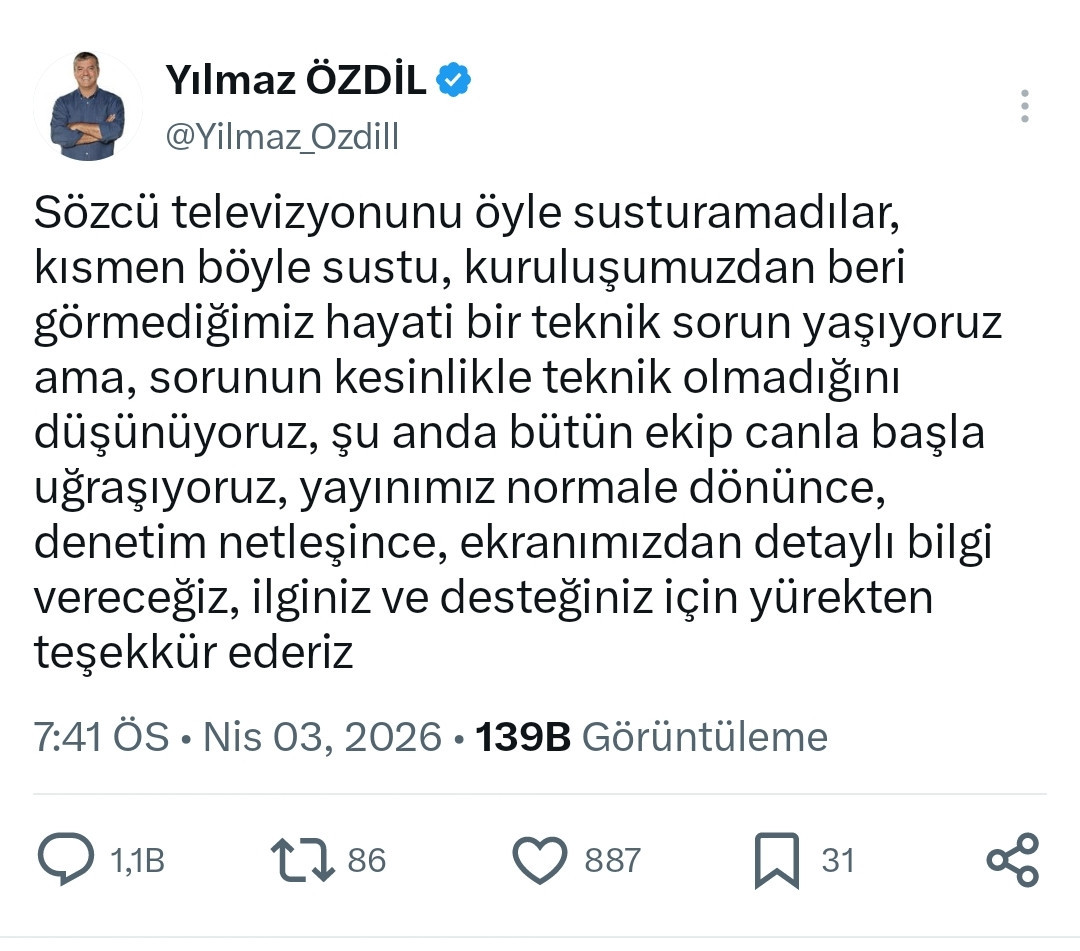 "Sözcü televizyonunu öyle susturamadılar, kısmen böyle sustu. Kuruluşumuzdan beri görmediğimiz hayati bir teknik sorun yaşıyoruz ama sorunun kesinlikle teknik olmadığını düşünüyoruz."