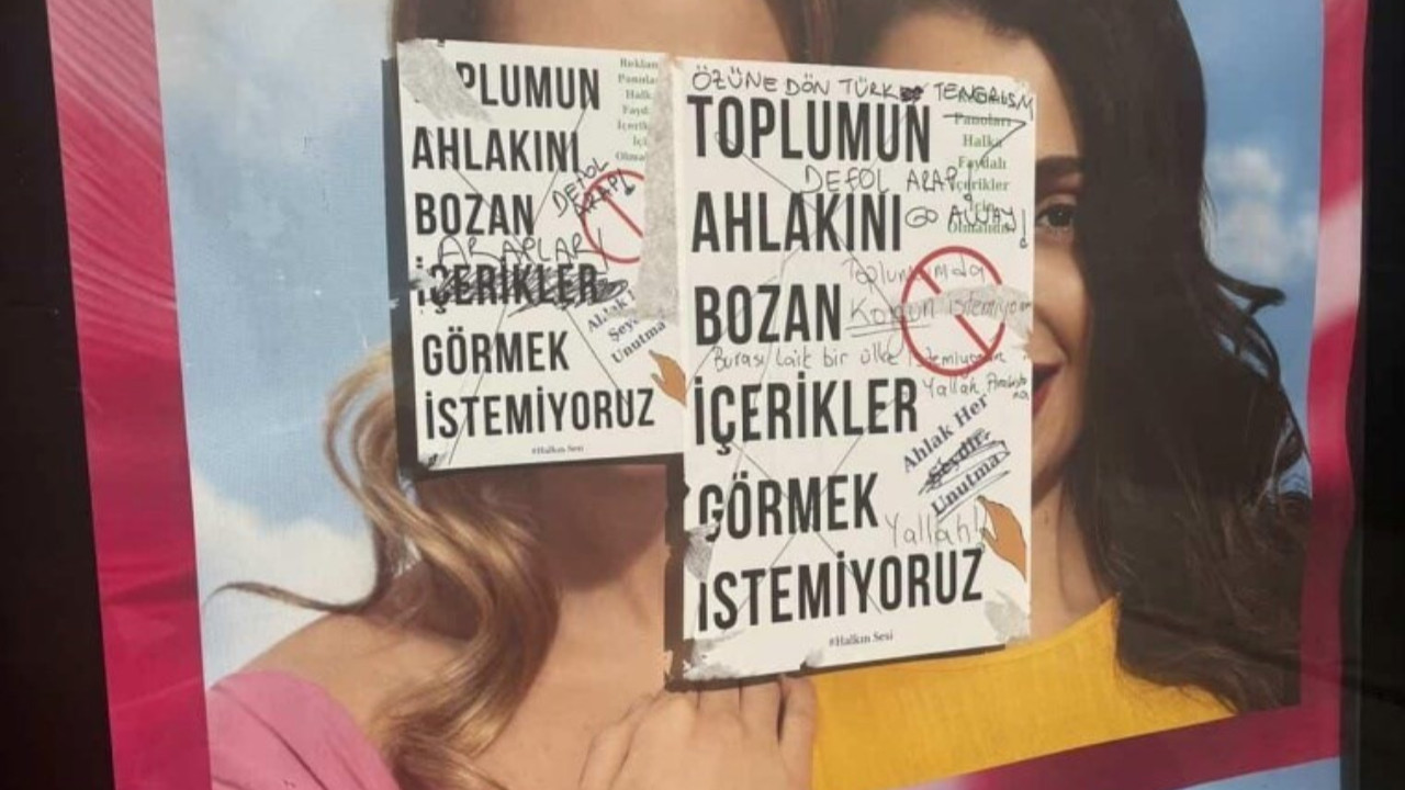 Bir reklam panosunda yer alan fotoğrafların üzerine "Toplumun ahlakını bozan içerikler görmek istemiyoruz" yazısının yer aldığı bir çıkarma yapıştırıldı.
