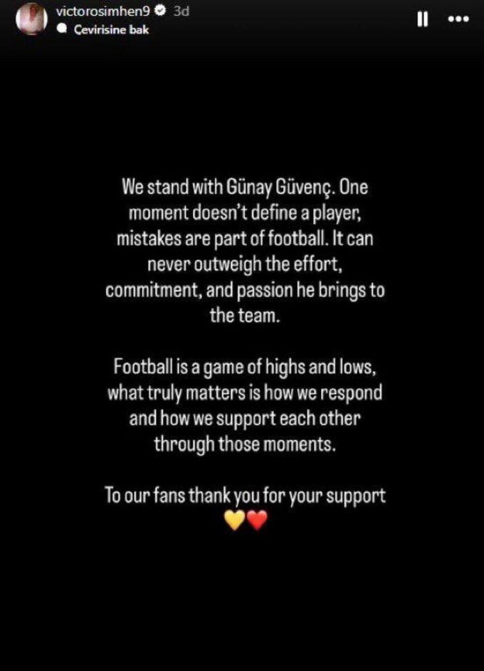 ''Günay Güvenç'in yanındayız. Tek bir an bir oyuncuyu tanımlamaz, hatalar futbolun bir parçasıdır. Bu hatalar; onun takıma kattığı çabanın, bağlılığın ve tutkunun asla önüne geçemez. Futbol inişler ve çıkışlarla dolu bir oyundur. Asıl önemli olan bu anlara nasıl tepki verdiğimiz ve bu süreçte birbirimize nasıl destek olduğumuzdur. Taraftarlarımıza destekleri için teşekkür ederiz."