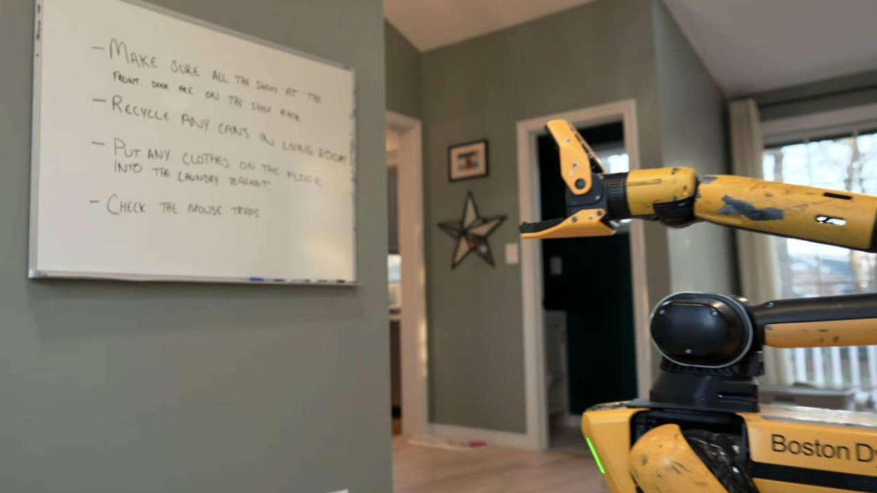 Gemini Robotics-ER 1.6 yapay zeka modelini kullanan dört ayaklı cihazın tanıtımında, robotun görevleri tahtadan okuduktan sonra yerine getirdiği görülüyor.