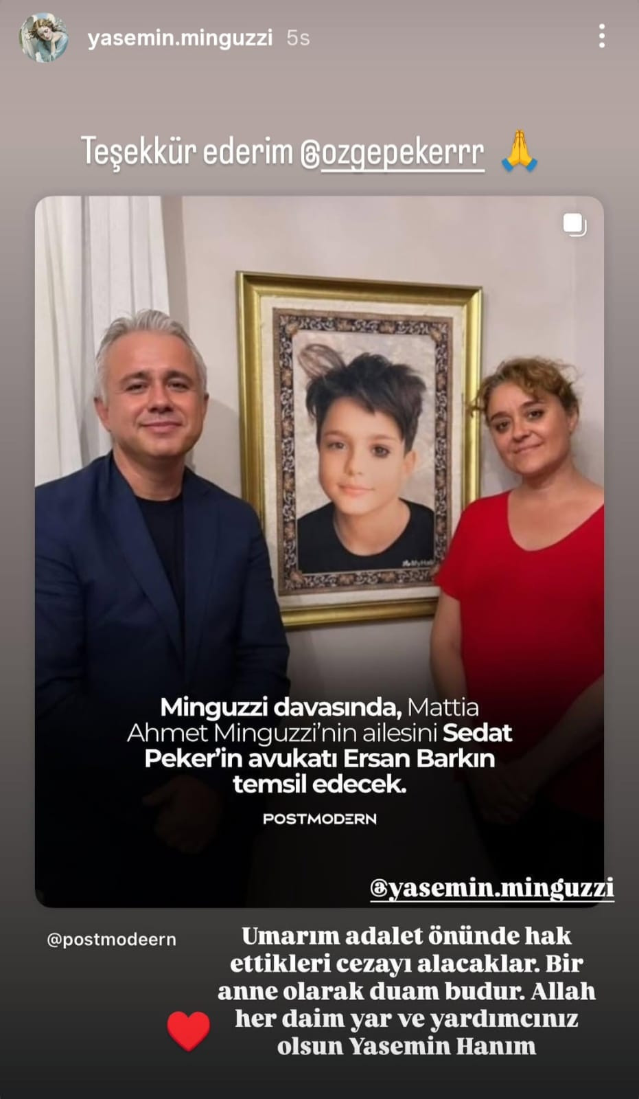 Yasemin Minguzzi, Özge Peker'in "Umarım adalet önünde hak ettikleri cezayı alacaklar. Bir anne olarak duam budur. Allah her daim yar ve yardımcınız olsun Yasemin Hanım" paylaşımını hesabından paylaşarak teşekkür etti.