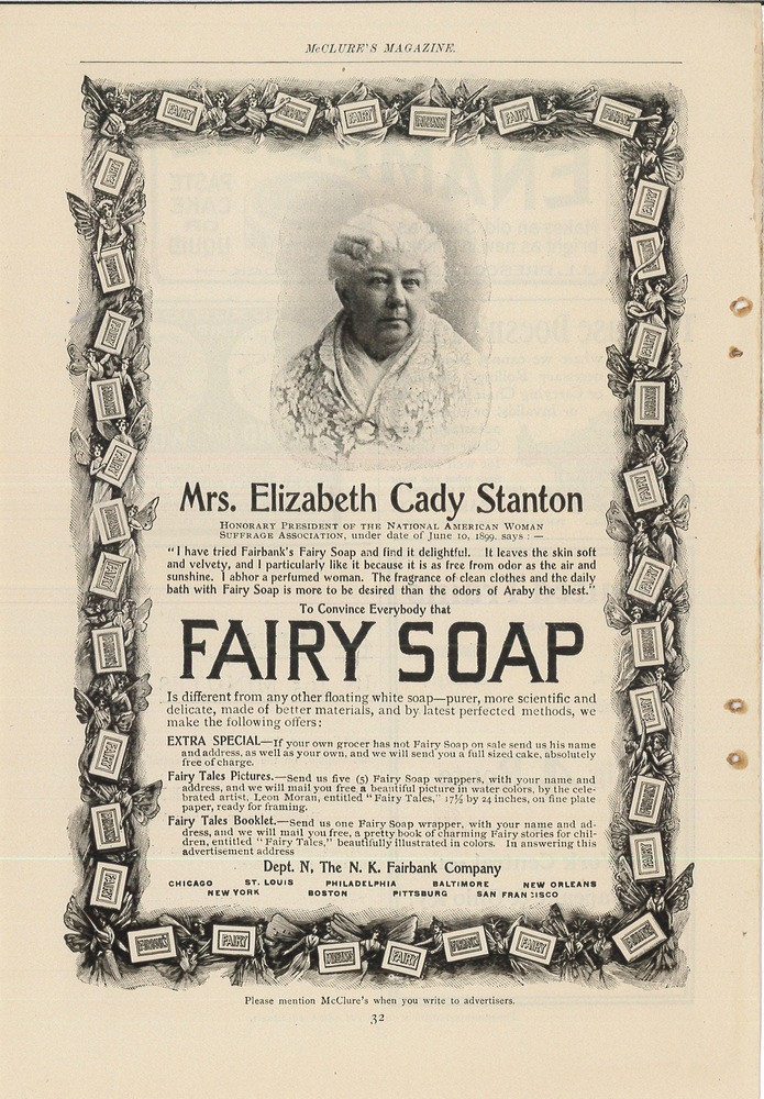 Kölelik karşıtı ve kadın hakları savunucusu aktivist yazar Elizabeth Cady Stanton'ın 1899 tarihli "Fairy" sabun reklamı için; "Fairbank's Fairy Soap"i denediğini ve çok hoş bulduğunu söylediği afiş, konuya yaklaşım bakımından dikkat çekicidir.