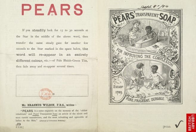 1884 tarihli "Pears" sabun reklamı bunun en açık örneğiydi. İlk görselde beyaz derili bir çocuk "Pears"